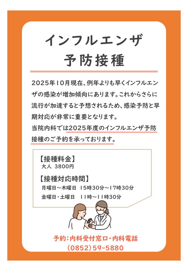 - ※注射などの処置については、休診日及び時間外でも必要に応じて行っています。